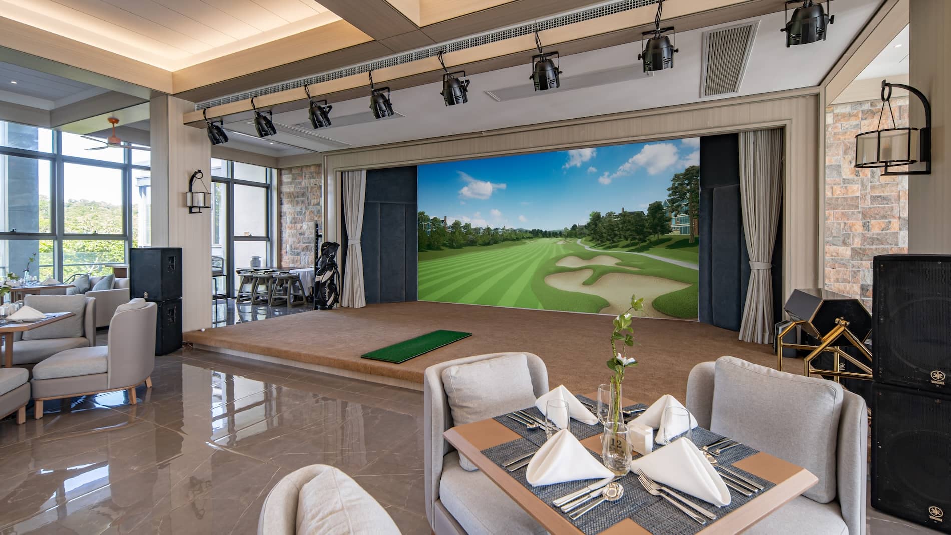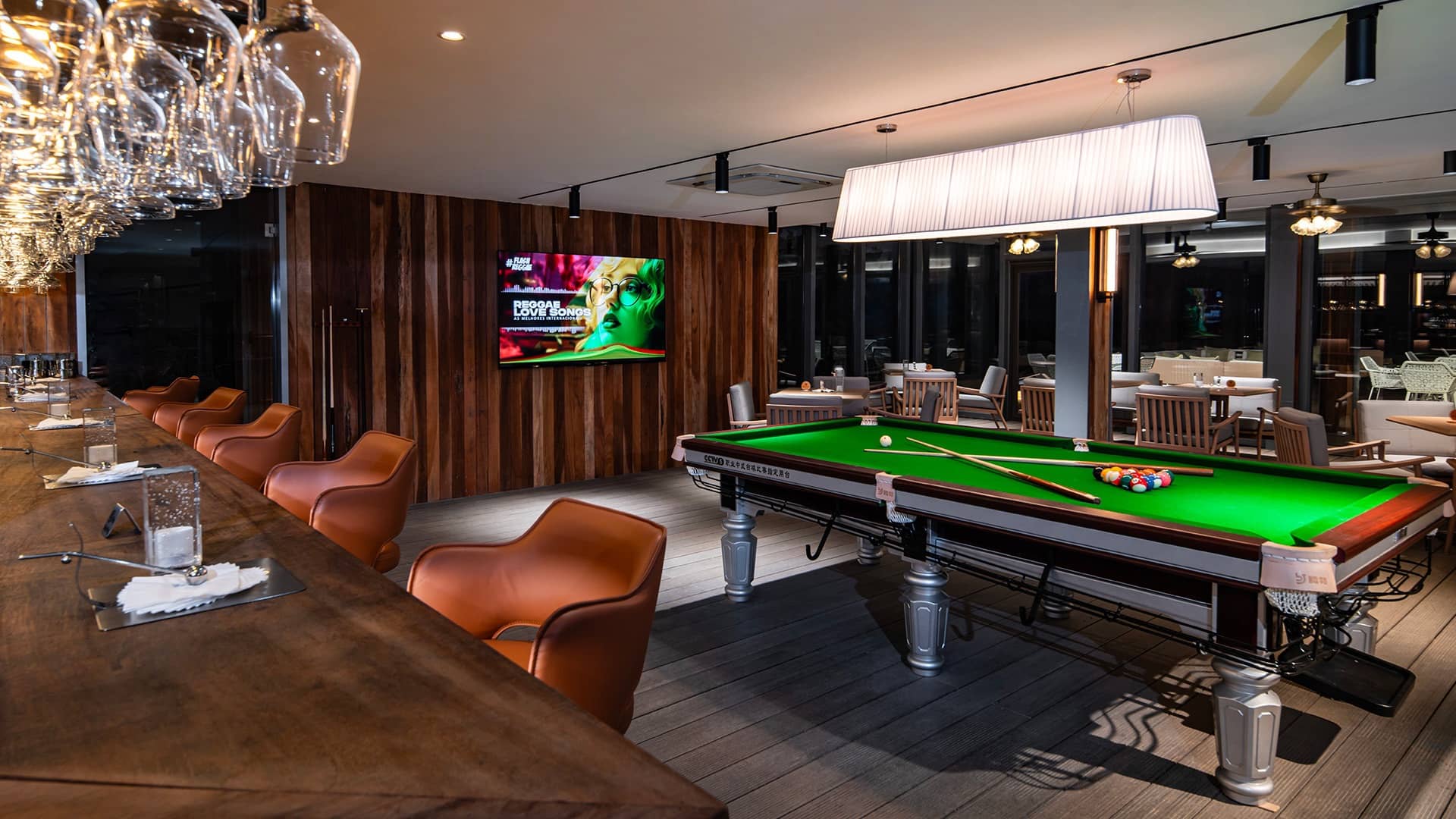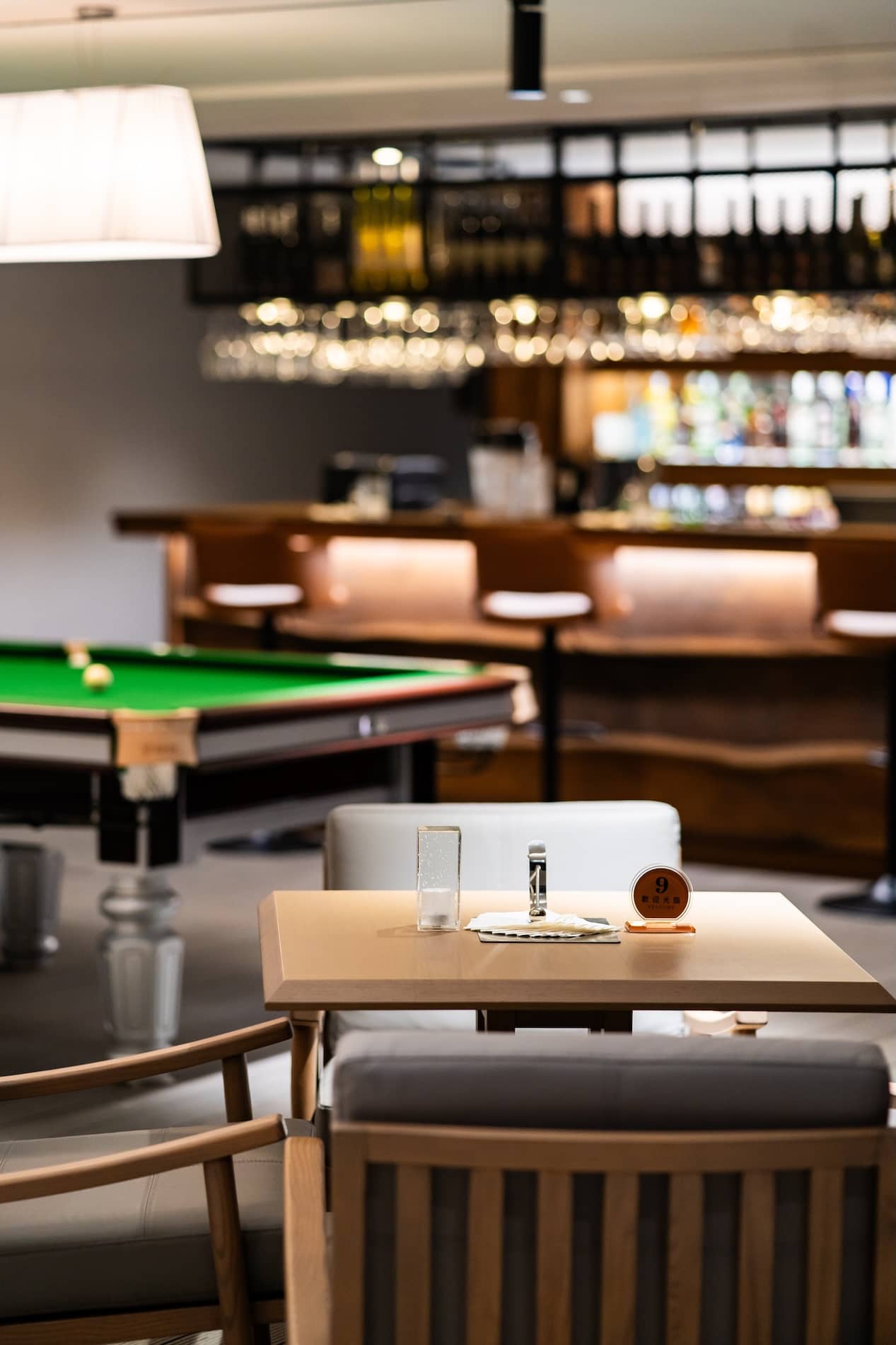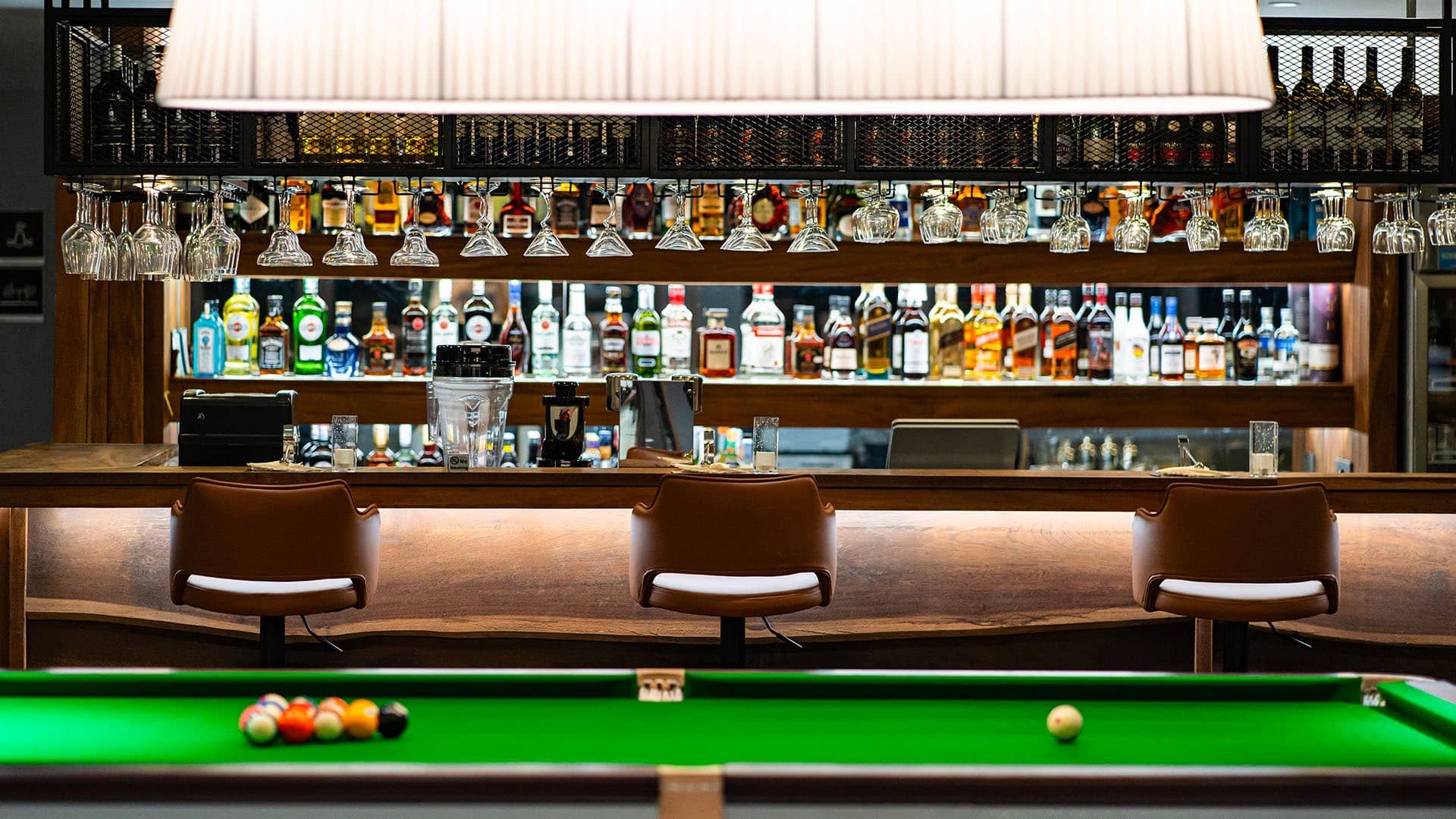 Chic bar with designer lighting fixtures and contemporary decor