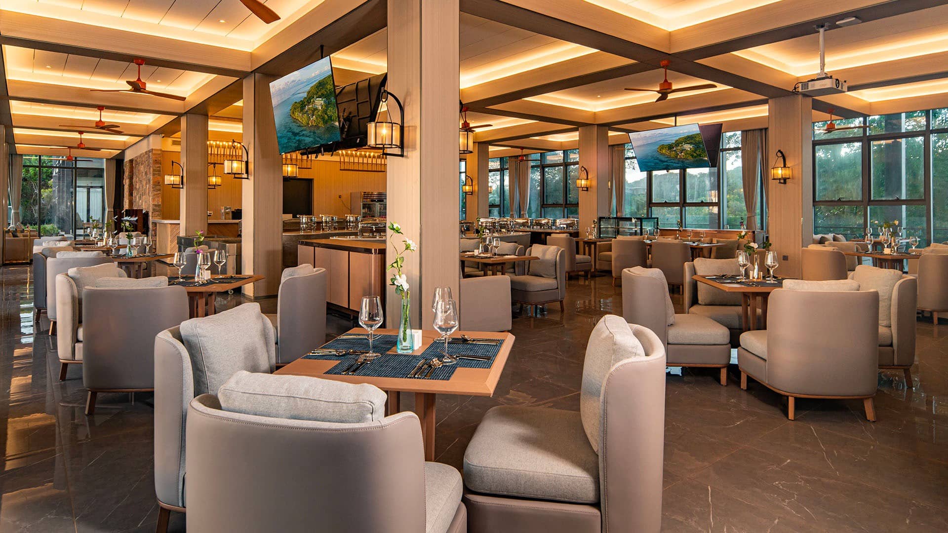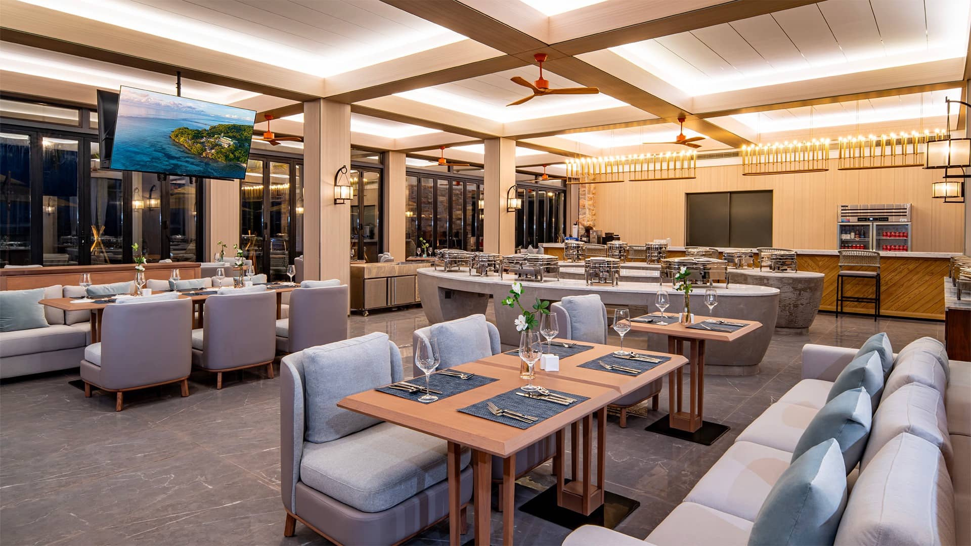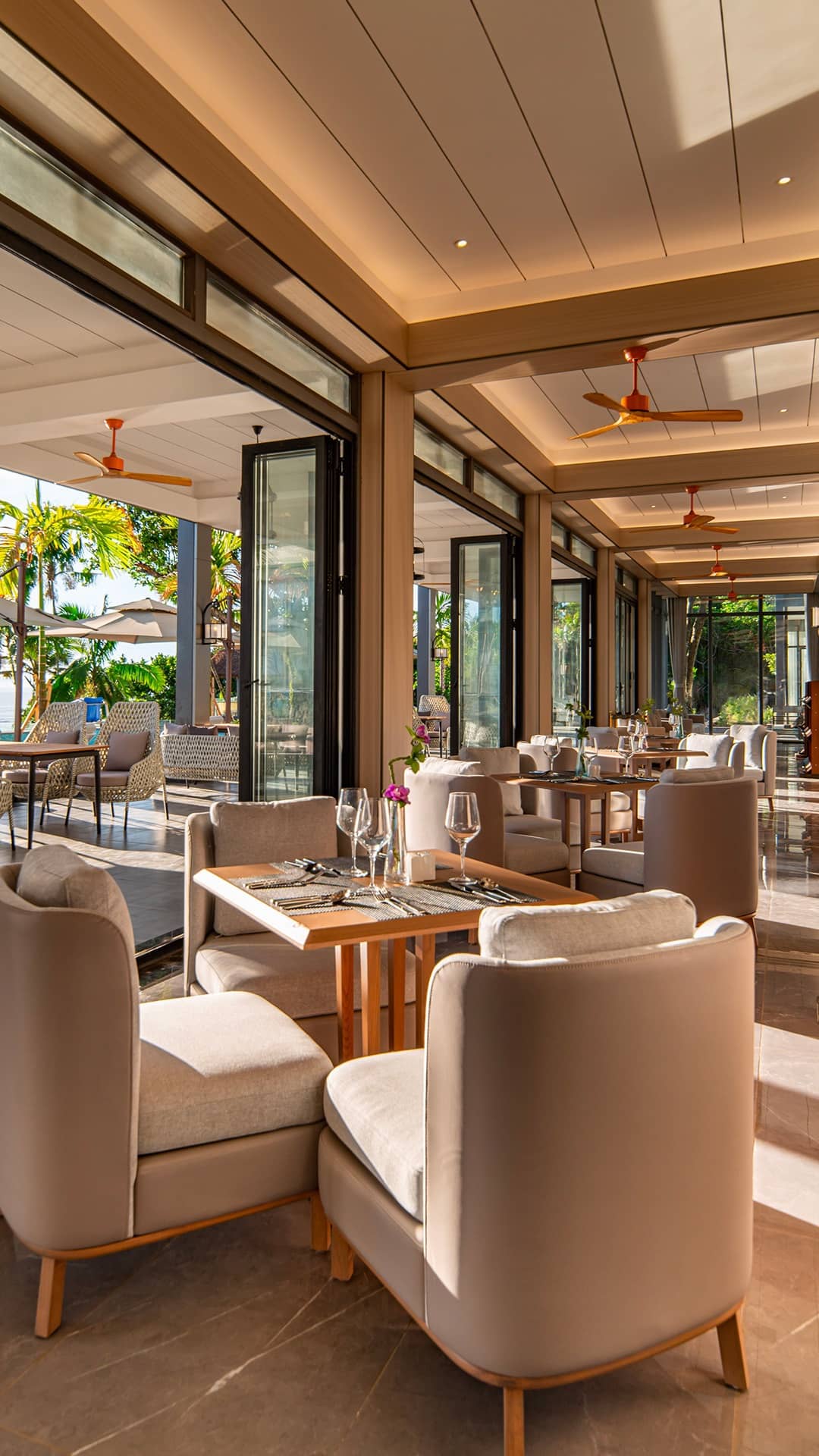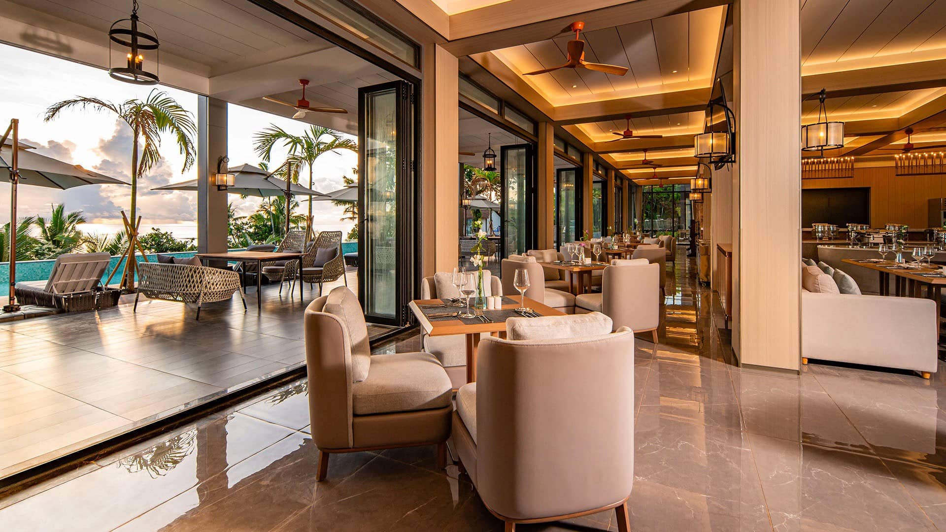 Modern restaurant interior with exposed brick wall, glass wine cellar, wooden dining tables, beige armchairs, and open doors leading to terrace with ocean views at sunset