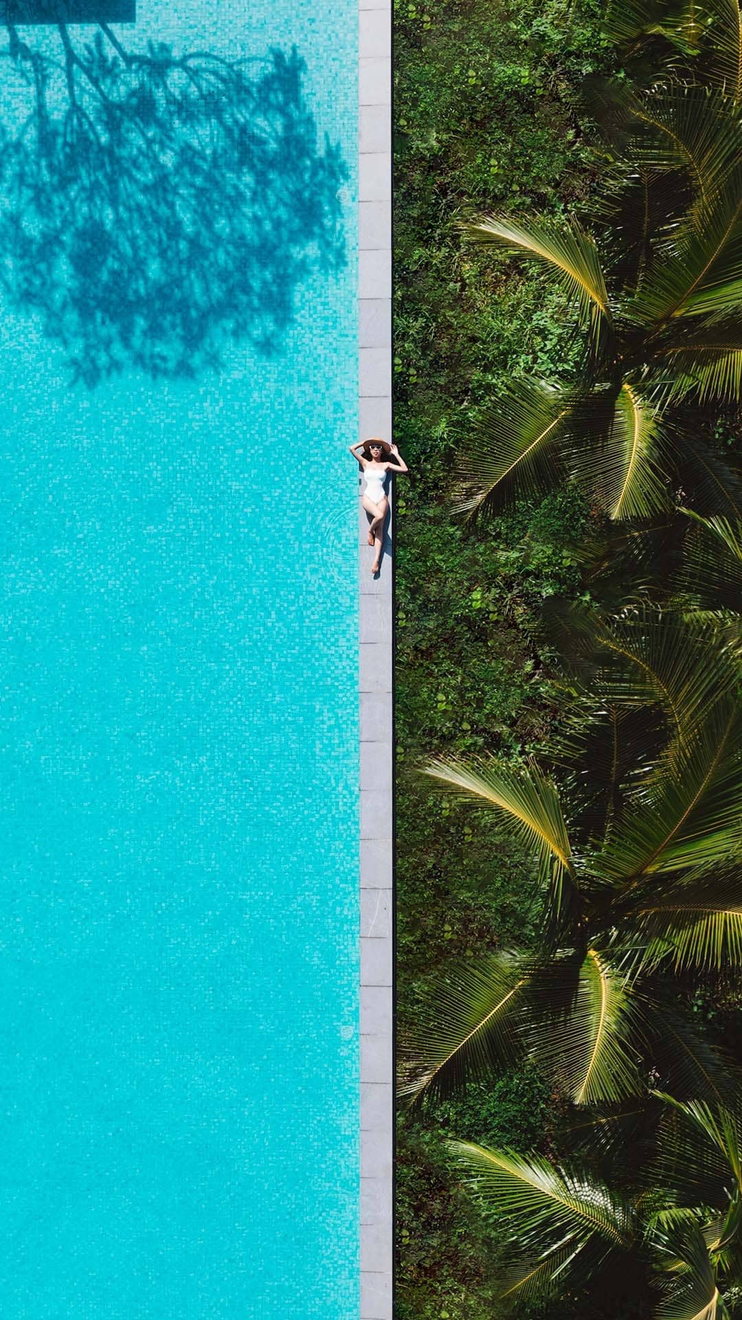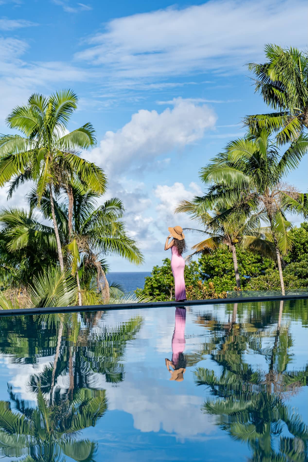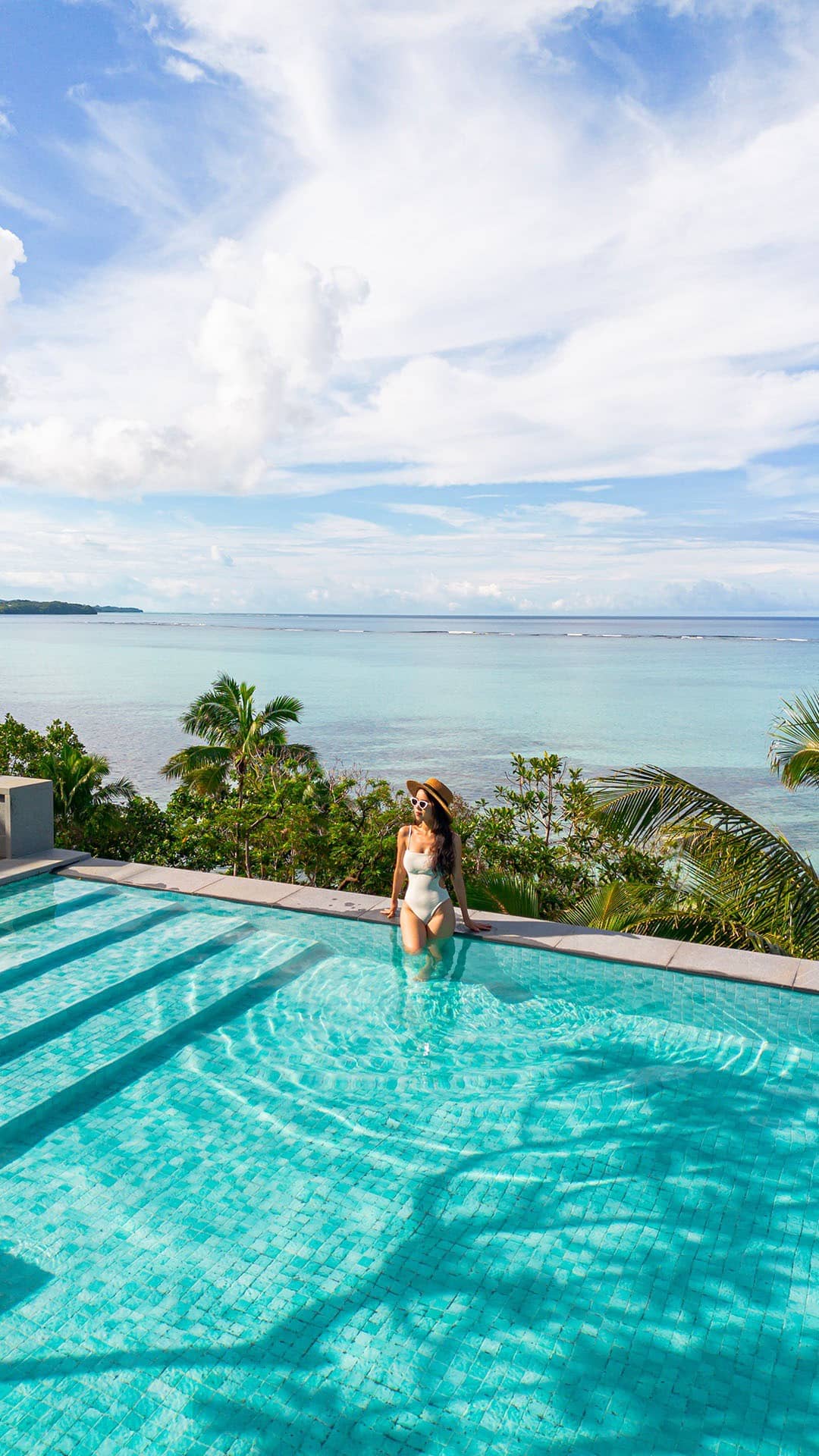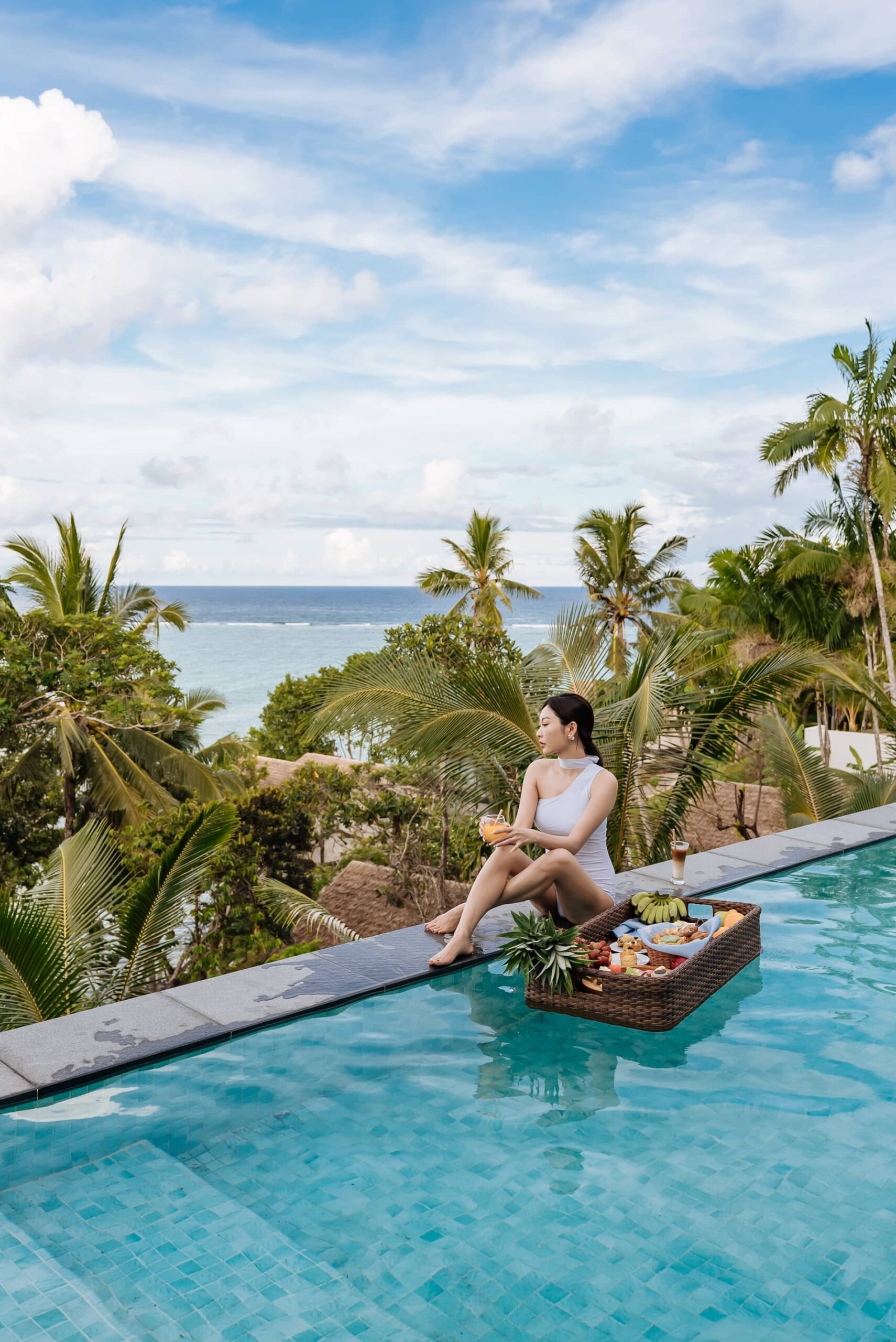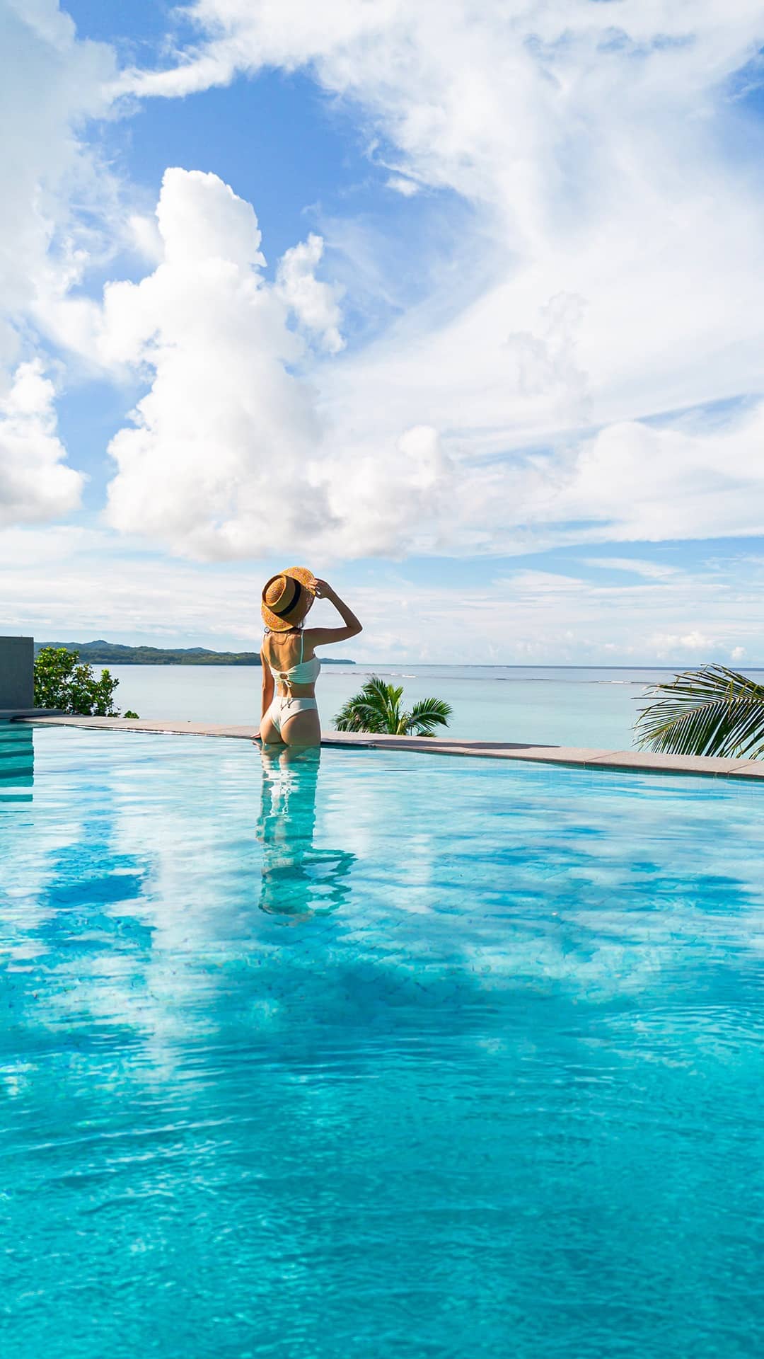 Woman relaxing in infinity pool with palm trees and serene ocean horizon under blue sky