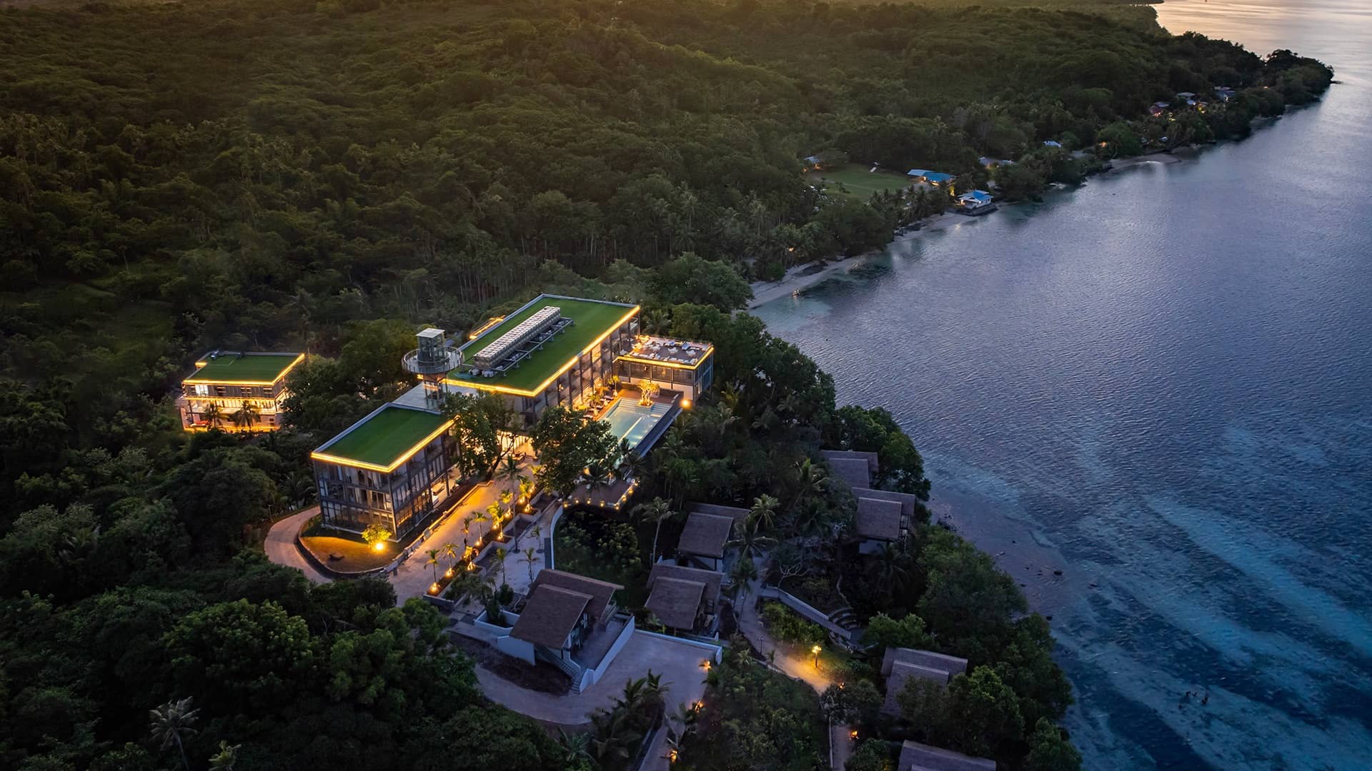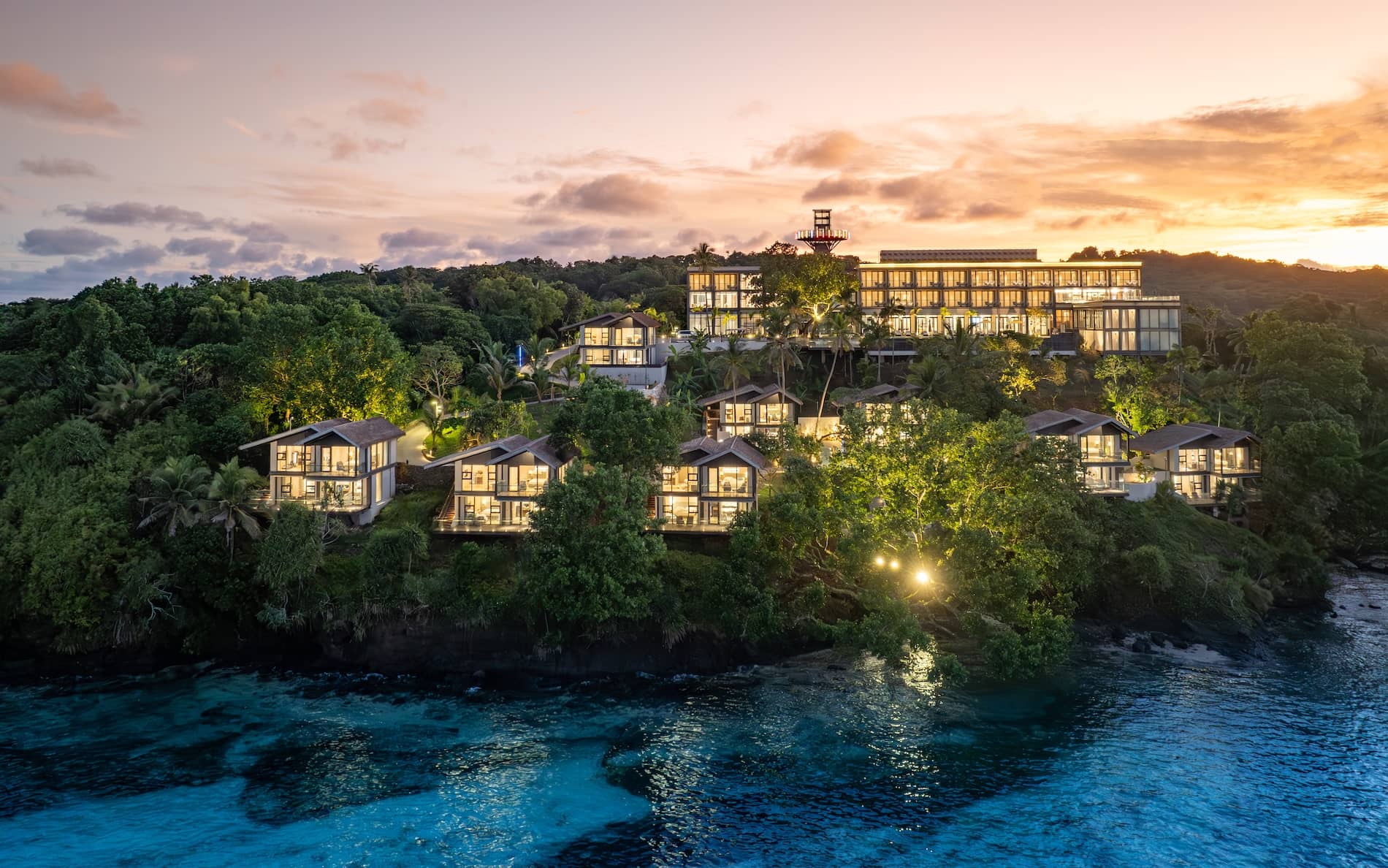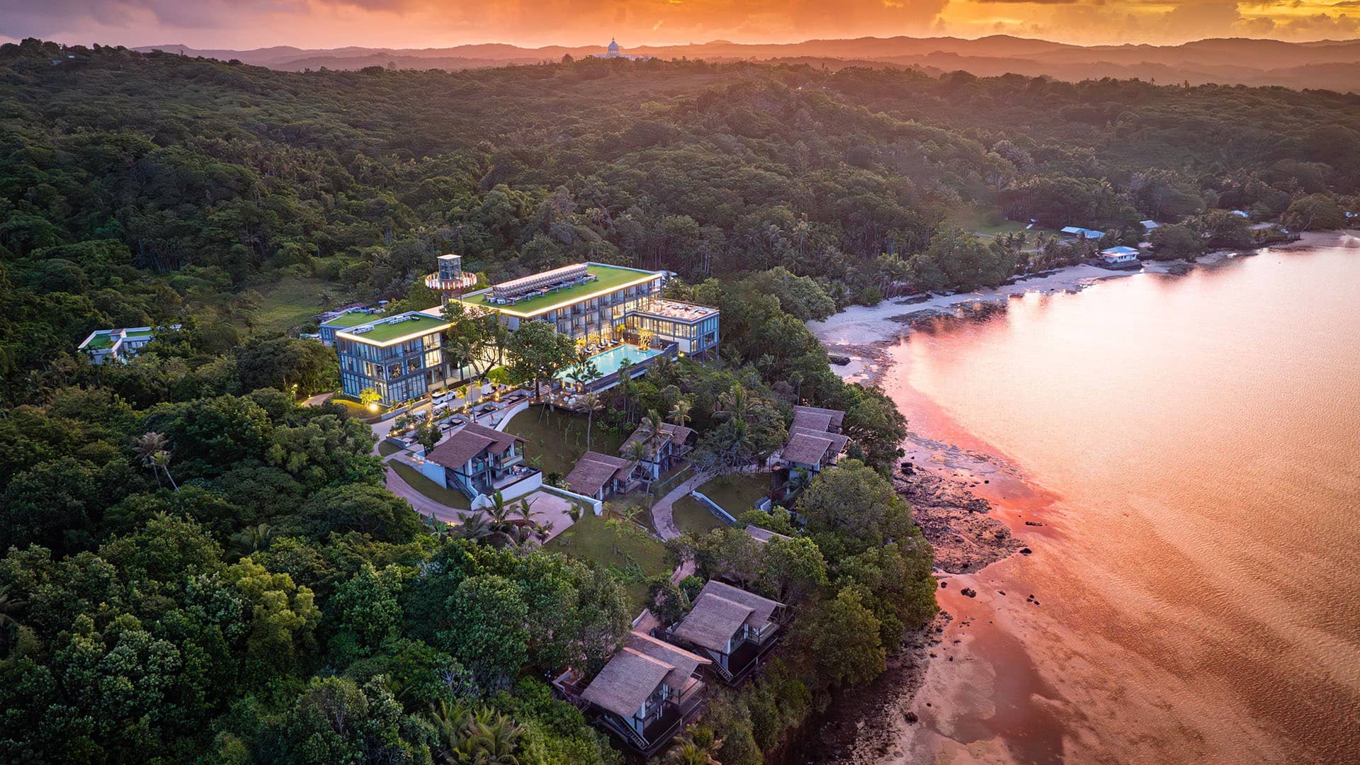 Dramatic sunset aerial view of tropical resort and villas nestled in jungle along tranquil bay with colorful sky