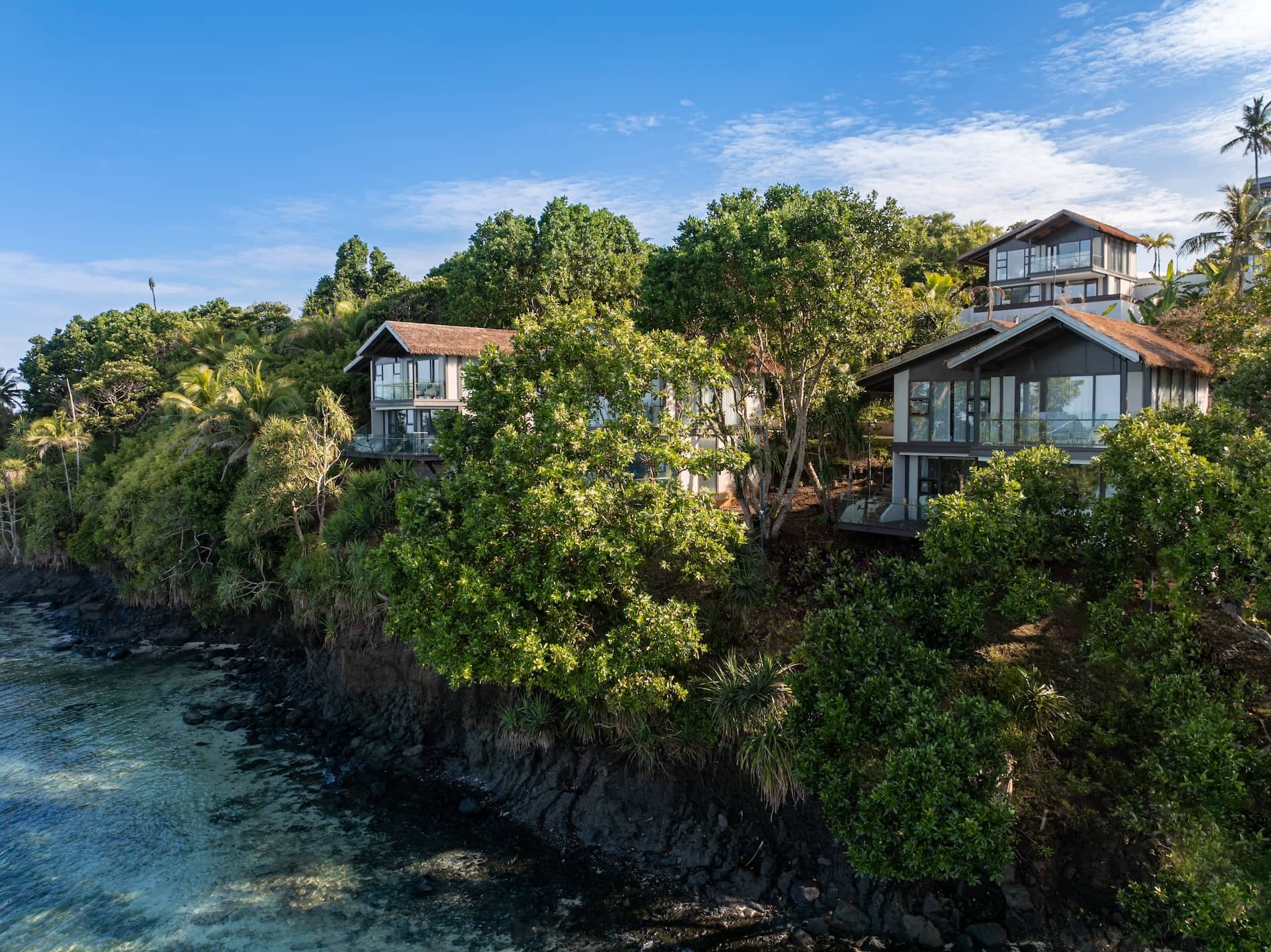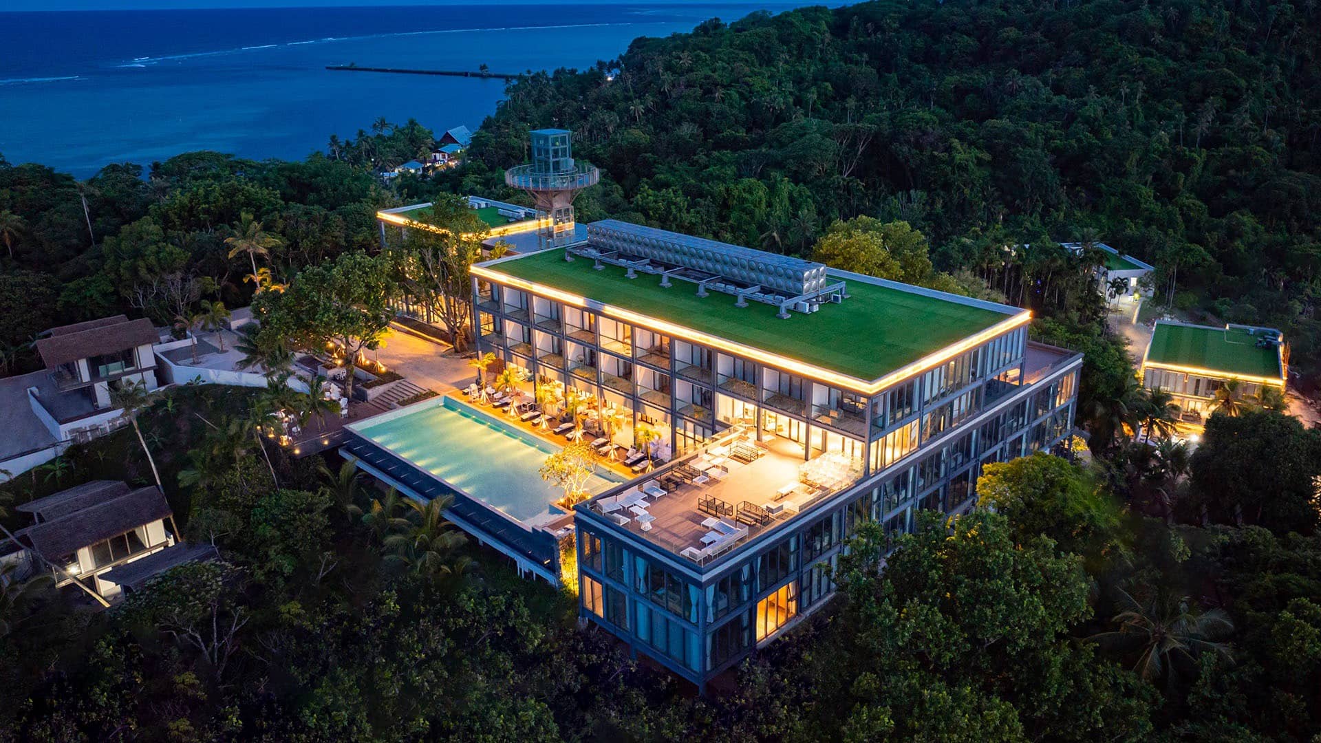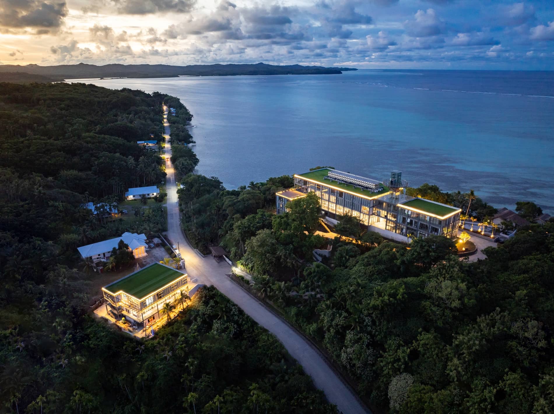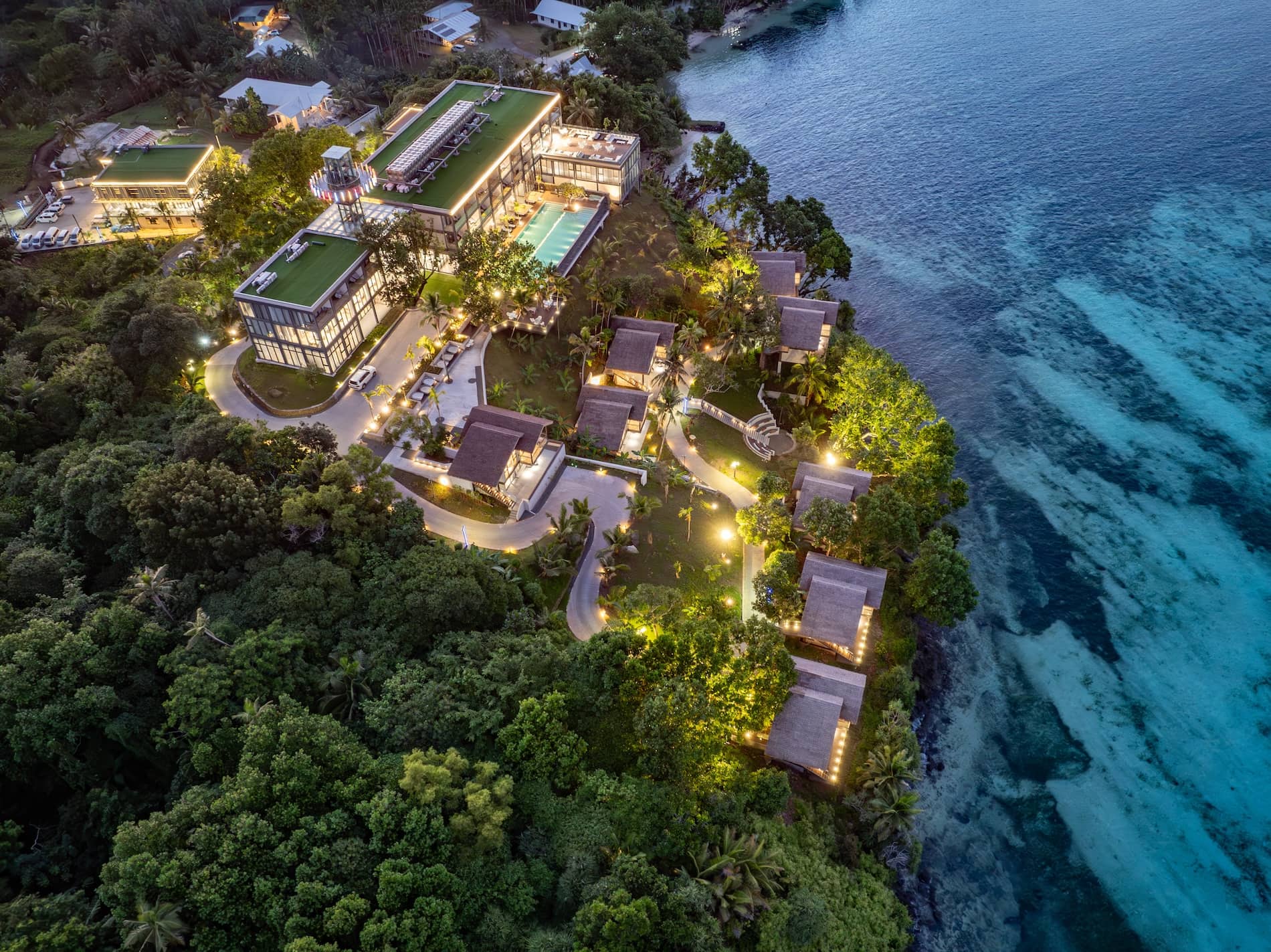 Dramatic sunset aerial view of tropical resort and villas nestled in jungle along tranquil bay with colorful sky
