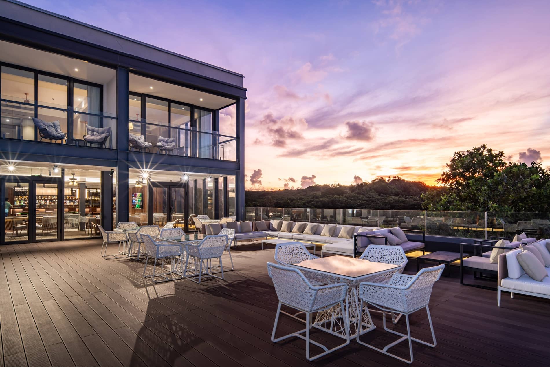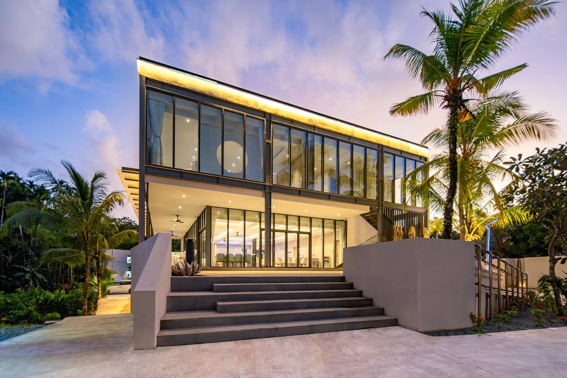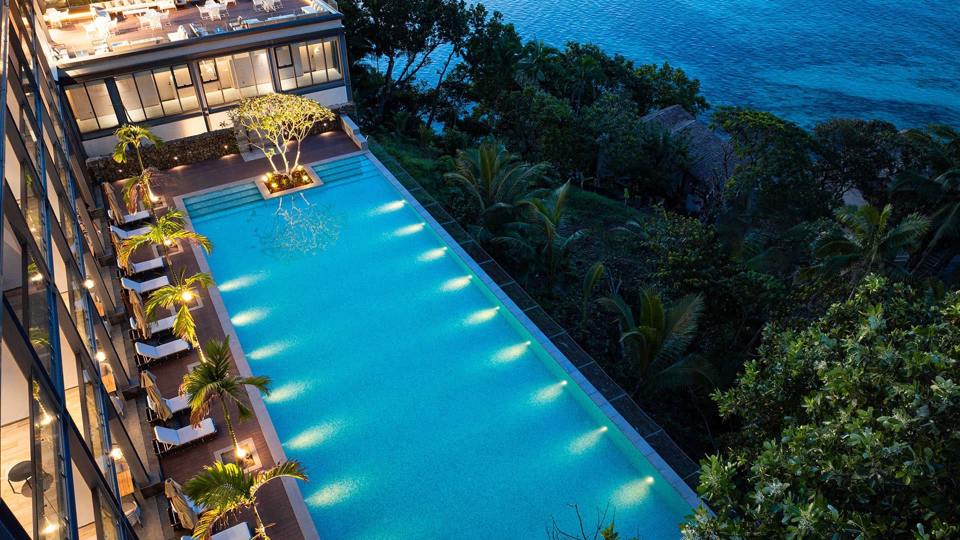Luxurious infinity pool terrace at dusk with lounge chairs, tropical palms, modern architecture, and serene ocean horizon views