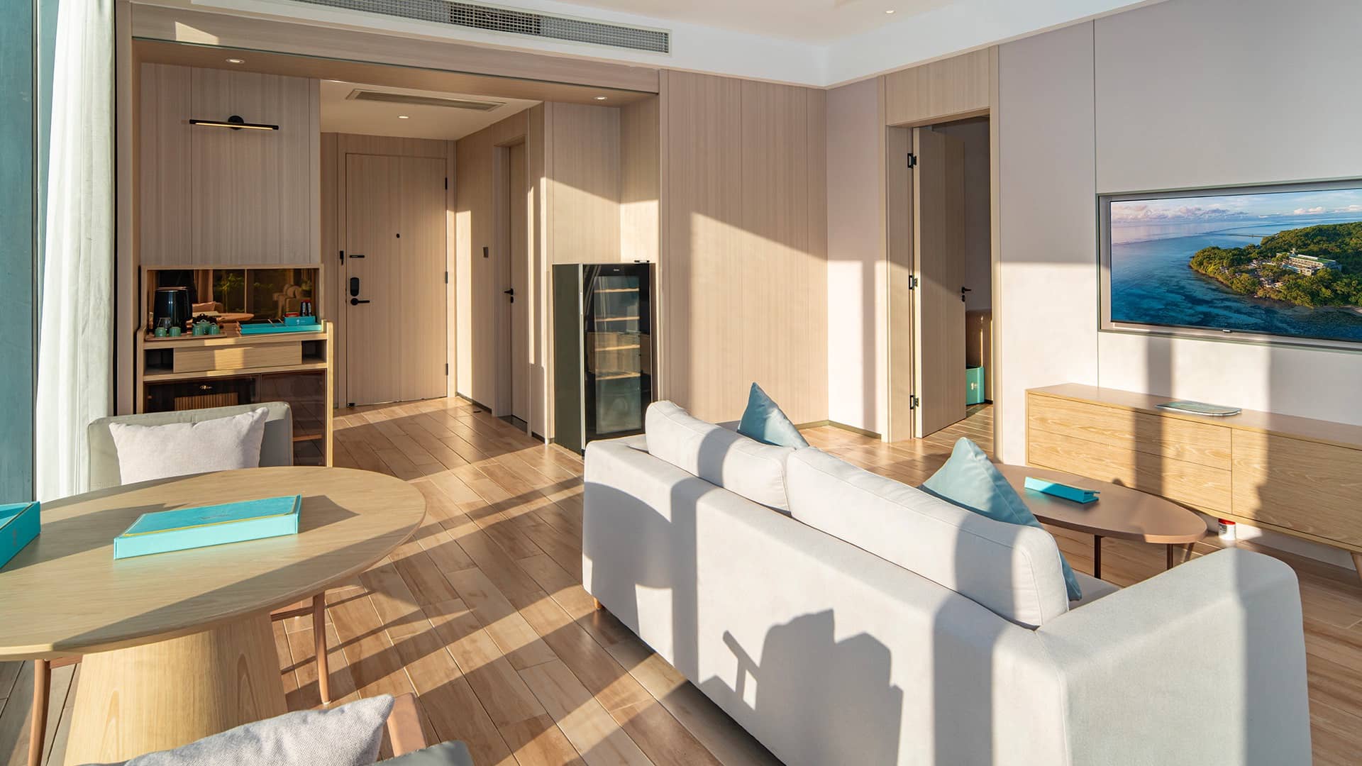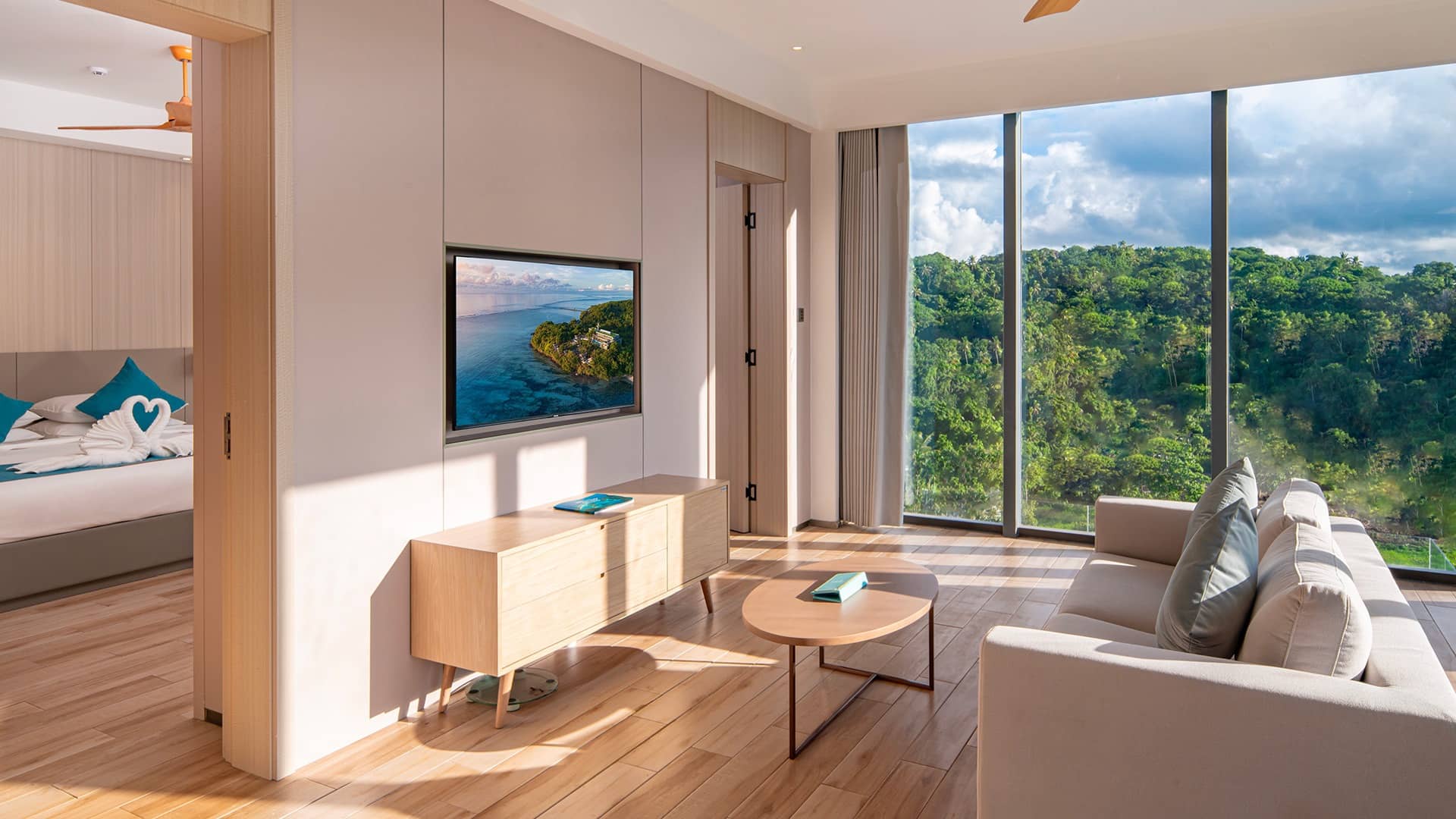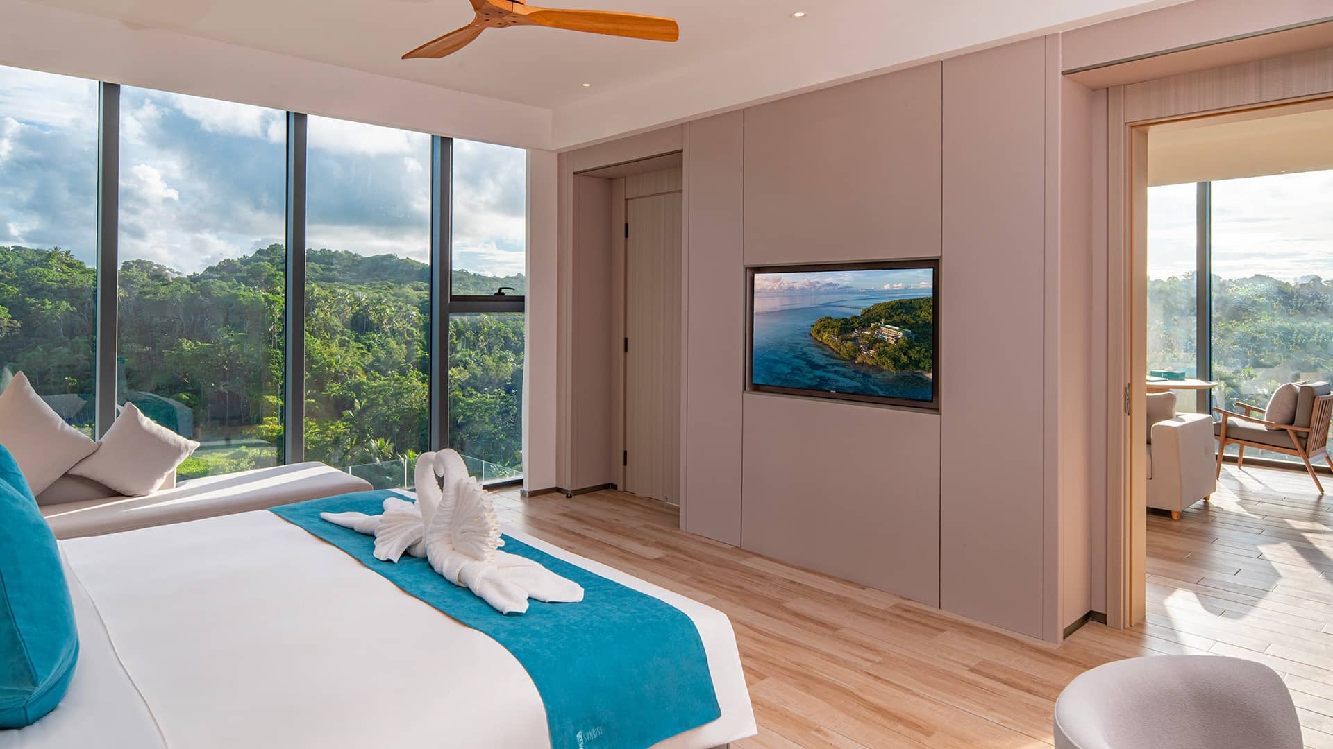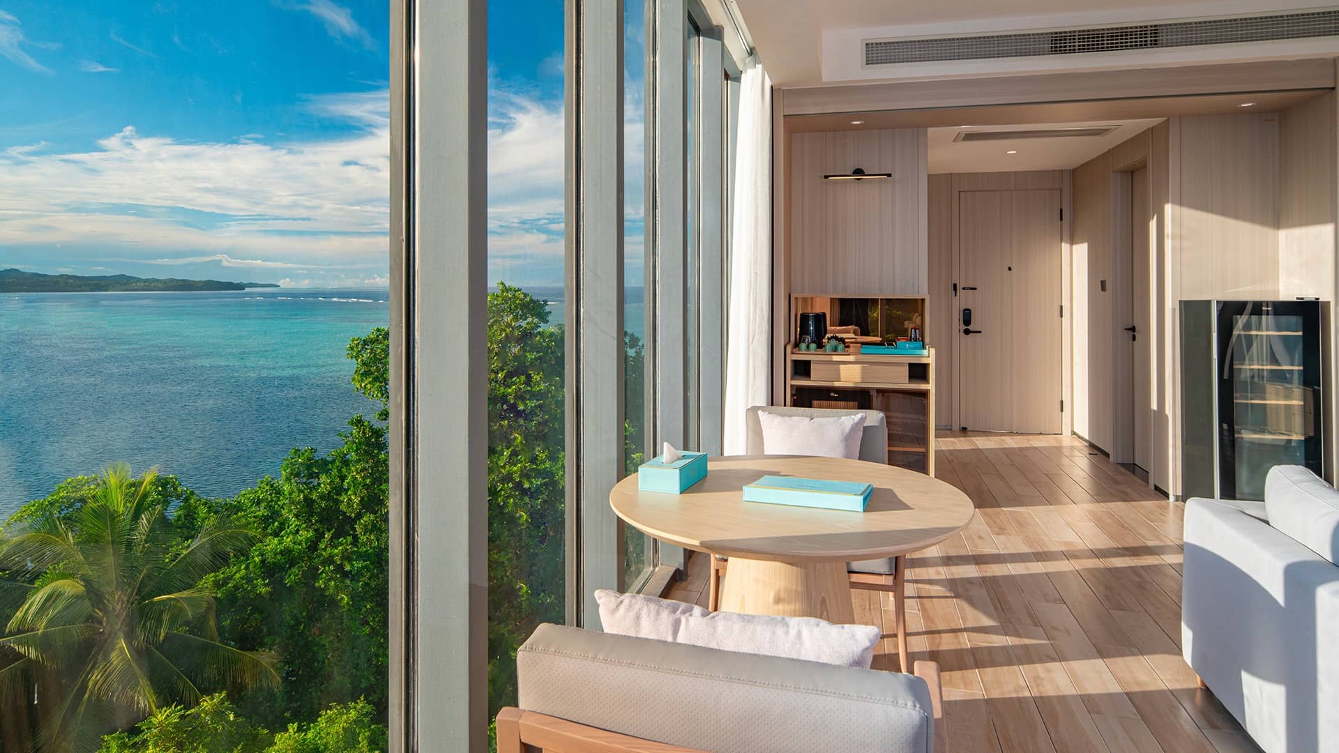 Luxurious Signature Sunrise Suite living area with panoramic ocean and jungle views, modern furnishings, kitchenette, and floor-to-ceiling windows